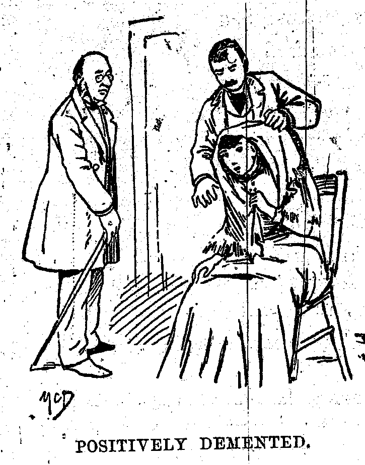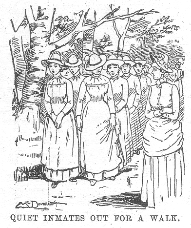 “A few more songs and we were told to go with Miss Grupe. We were taken into a cold, wet bathroom, and I was ordered to undress. Did I protest? Well, I never grew so earnest in my life as when I tried to beg off. They said if I did not they would use force and that it would not be very gentle. At this I noticed one of the craziest women in the ward standing by the filled bathtub with a large, discolored rag in her hands. She was chattering away to herself and chuckling in a manner which seemed to me fiendish. I knew now what was to be done with me. I shivered. They began to undress me, and one by one they pulled off my clothes. At last everything was gone excepting one garment. ‘I will not remove it,’ I said vehemently, but they took it off. I gave one glance at the group of patients gathered at the door watching the scene, and I jumped into the bathtub with more energy than grace.