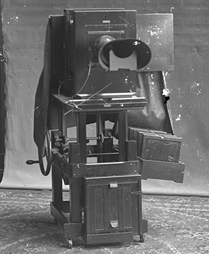 Like excavating an archeological site, layer by layer the material was carefully removed. At one point a small stack of dusty glass plates was uncovered, each measuring 5×7 inches. Holding one of the plates up to a window, a negative image on the glass could be seen. These glass plates were in fact hundred-year-old photographic negatives. Soon, more plates were uncovered in a broken cardboard box, and the dig continued. At the bottom of the pile several more boxes were found. Ultimately, hundreds of glass plates were discovered scattered throughout the room, some broken, some cracked, and most covered with a layer of dirt and plaster dust. Finally a path was cleared to the back of the room where a tall wooden cabinet stood. The cabinet door was pried open and there it was… the mother lode. Over the next several days over 5,000 glass dry-plate photo negatives were removed from the room.